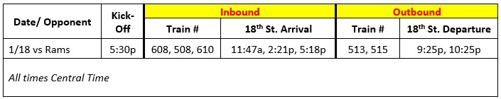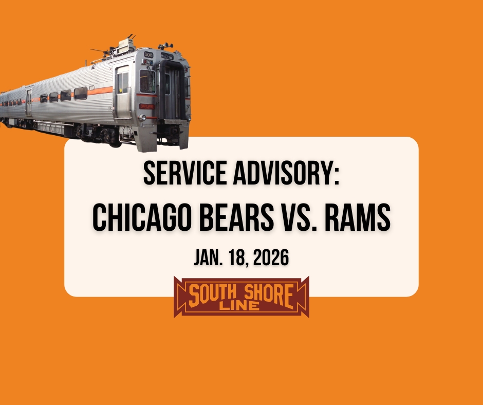 To accommodate passengers attending the Chicago Bearsvs. LA Rams divisional playoff game at 5:30pm on Sunday, Jan. 18, 2026, the South Shore Line will stop select trains at Metra’s 18th Street Station, which connects passengers directly to the Soldier Field entrance via a pedestrian walkway.