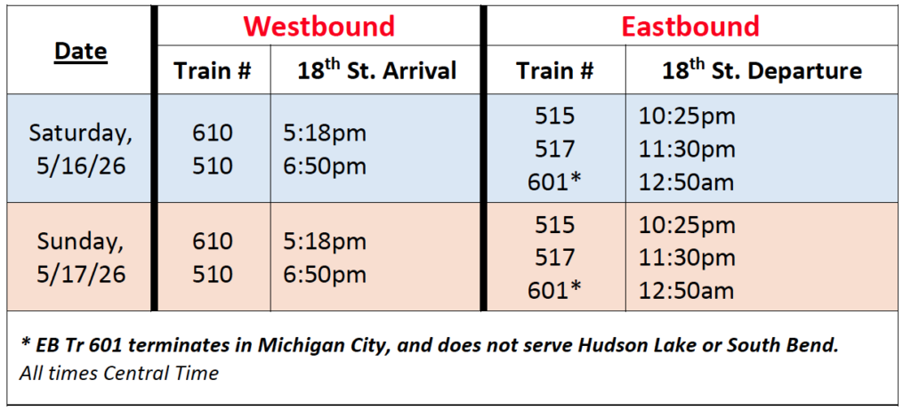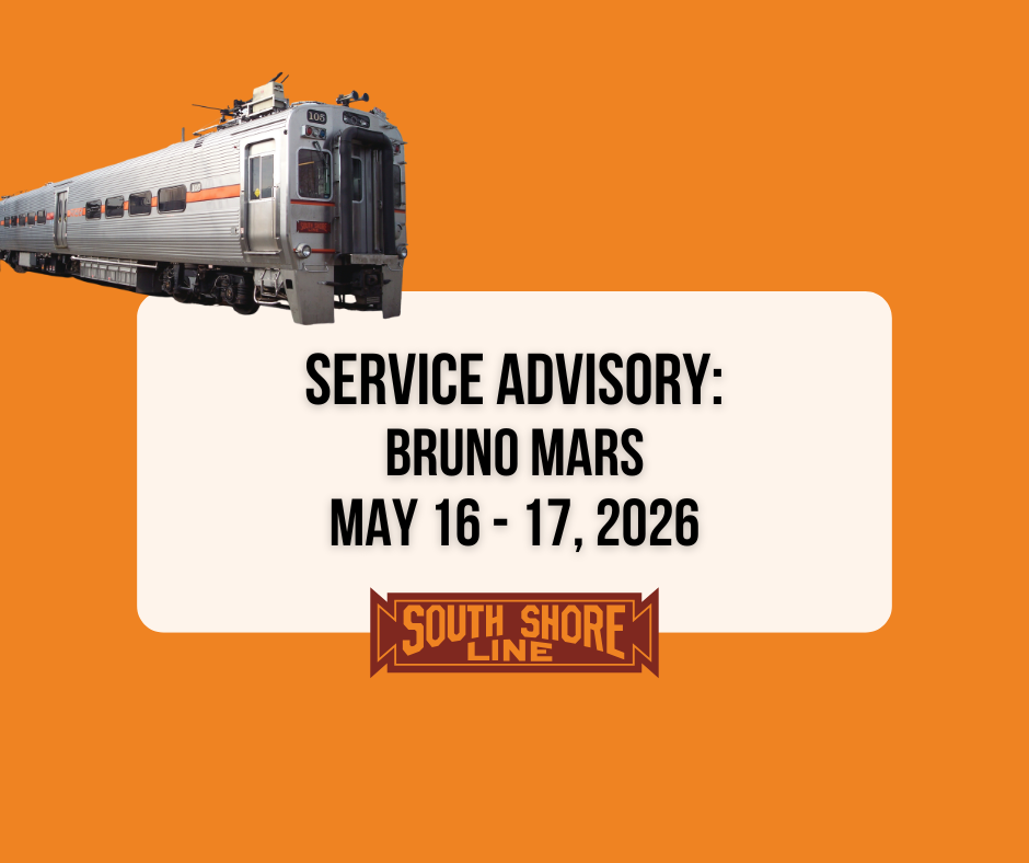To accommodate passengers attending Bruno Mars taking place at 7:30 p.m. Saturday, May 16, and Sunday, May 17, 2026, at Soldier Field, the South Shore Line plans to stop select trains at Metra’s 18th Street Station, which connects passengers directly to the Soldier Field entrance via a pedestrian walkway.