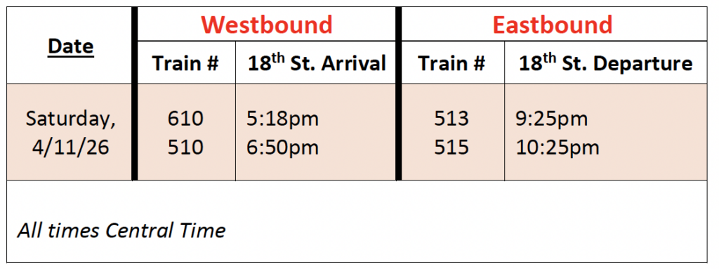The following trains will serve 18th St. Station on April 11 (Please cross-reference the SSL train schedule to find all station stop times for your selected train):