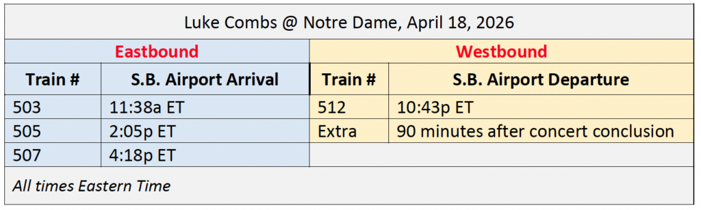 On April 18, regularly scheduled eastbound trains (including Tr 503, Tr 505 and Tr 507 below) will deliver passengers to the South Bend International Airport prior to the concert.