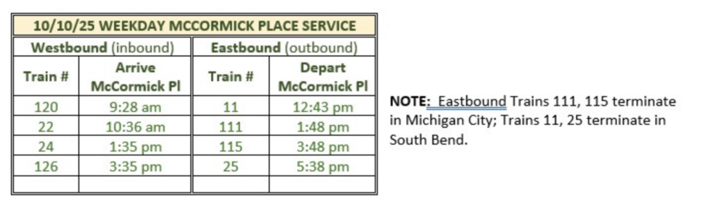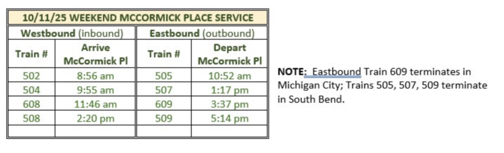 The South Shore Line will stop the following weekend trains at McCormick Place on Saturday, Oct. 11, for those attending the Abbott Health & Fitness Expo and Packet Pick-up: