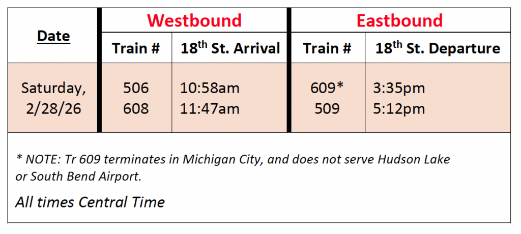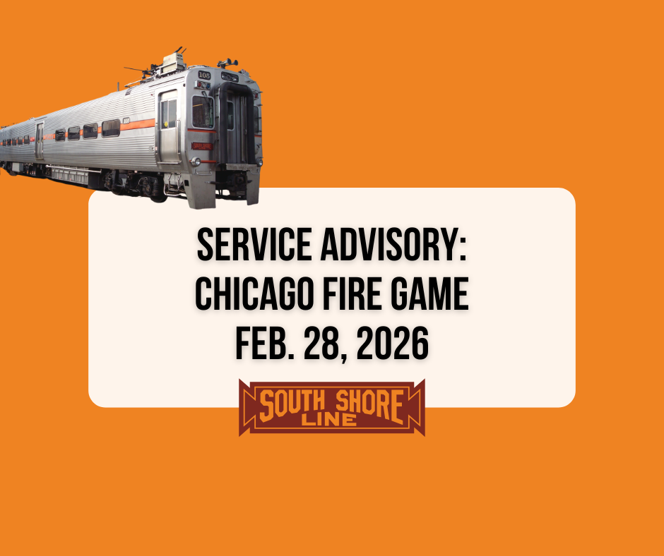 To accommodate passengers attending the Chicago Fire FC match taking place at 1:30 p.m., Saturday, Feb. 28, 2026, at Soldier Field, the South Shore Line plans to stop select trains at Metra’s 18th Street Station, which connects passengers directly to the Soldier Field entrance via a pedestrian walkway.