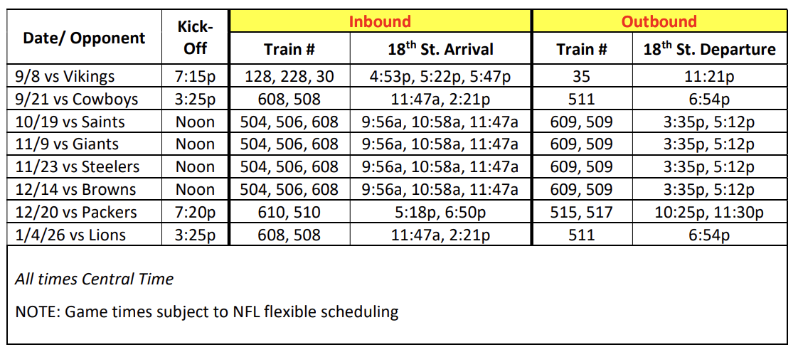 In addition to our regular service to nearby Museum Campus/11th St., the following trains will also serve 18th St. Station for Bears games: