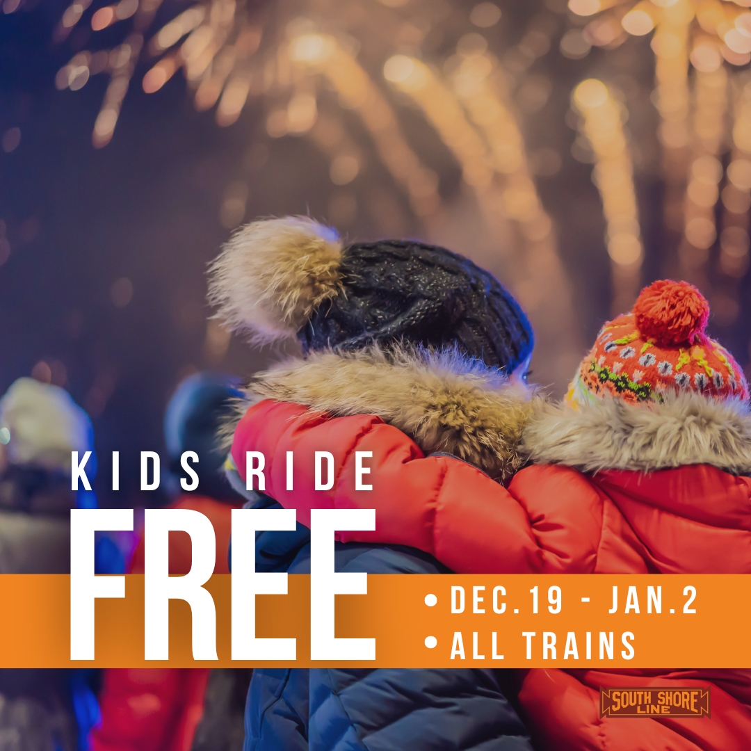 Friday, Dec. 19, 2025, through Friday, Jan. 2, 2026, up to three children 13 years of age and younger may ride any train for free — ALL weekend, holiday, off-peak or rush hour weekday trains — when accompanied by a parent or guardian.