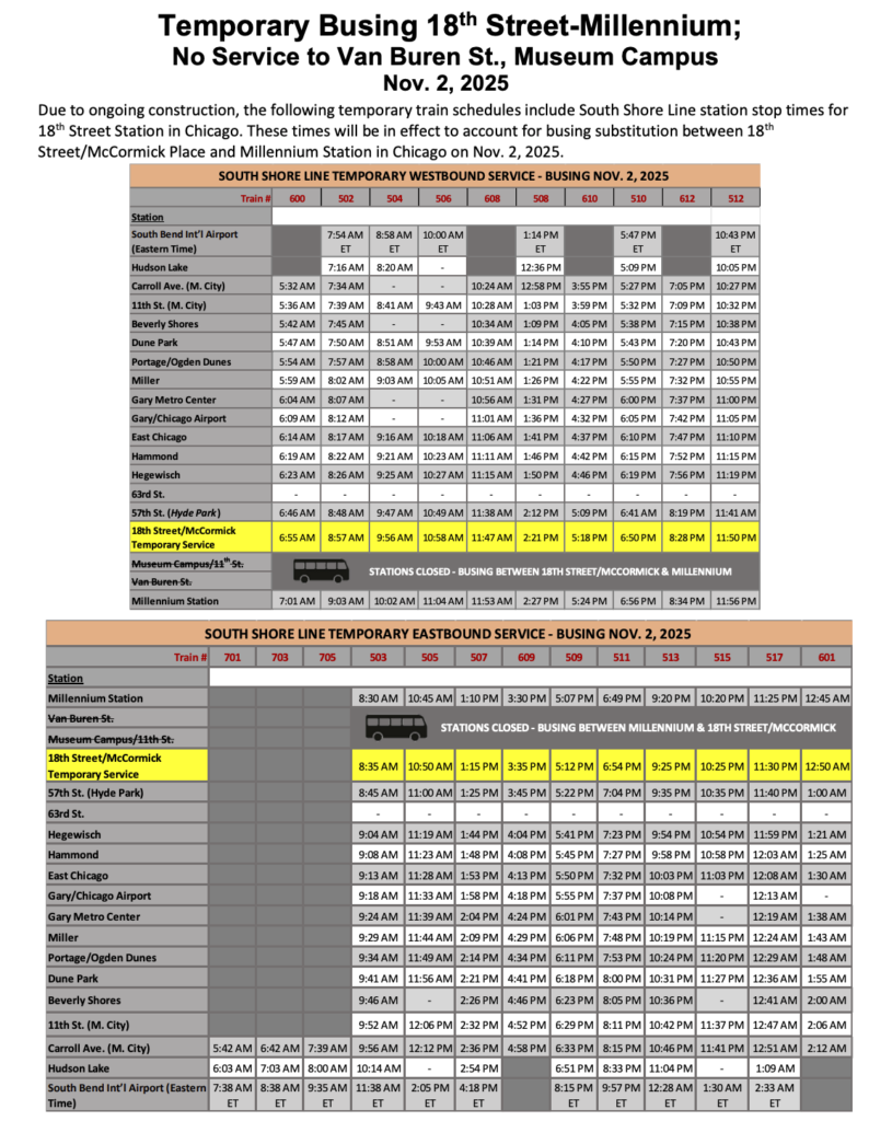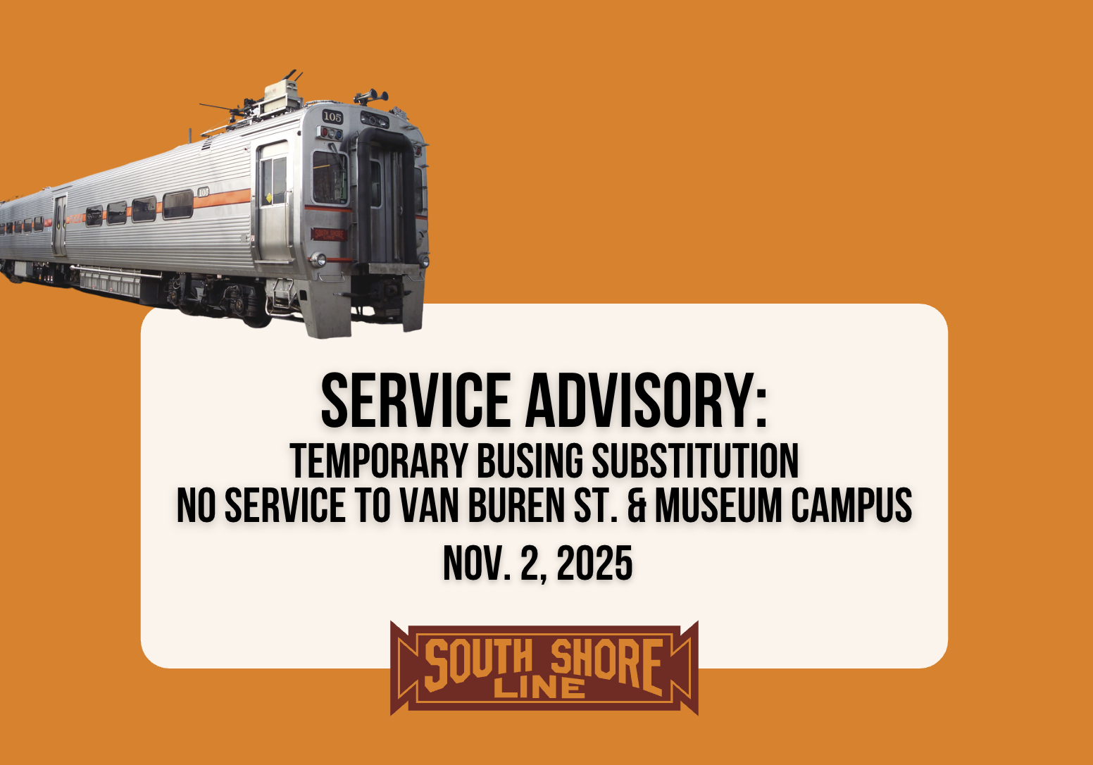 South Shore Line passengers are advised busing substitution will be in place on Sunday, Nov. 2, 2025, due to construction in Chicago. On Nov. 2, 2025, there will be NO SERVICE to Museum Campus or Van Buren Street stations.